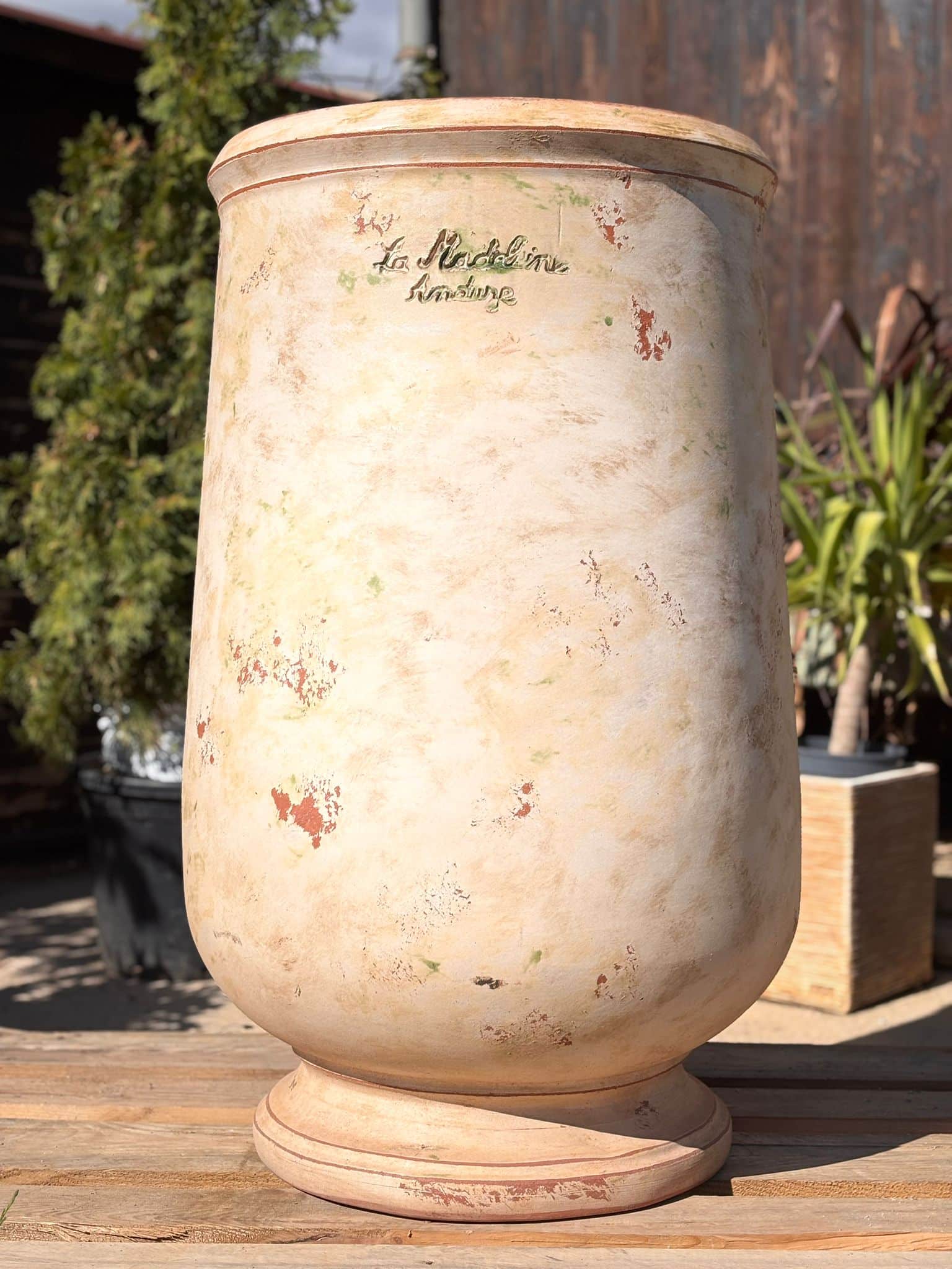 Les poteries d’Anduze sont des pots traditionnels en terre cuite, originaires de la ville d’Anduze, dans le Gard, au sud de la France. Elles se distinguent par leur forme élégante, évasée vers le haut, et leurs ornements caractéristiques, comme des guirlandes et des médaillons en relief.
